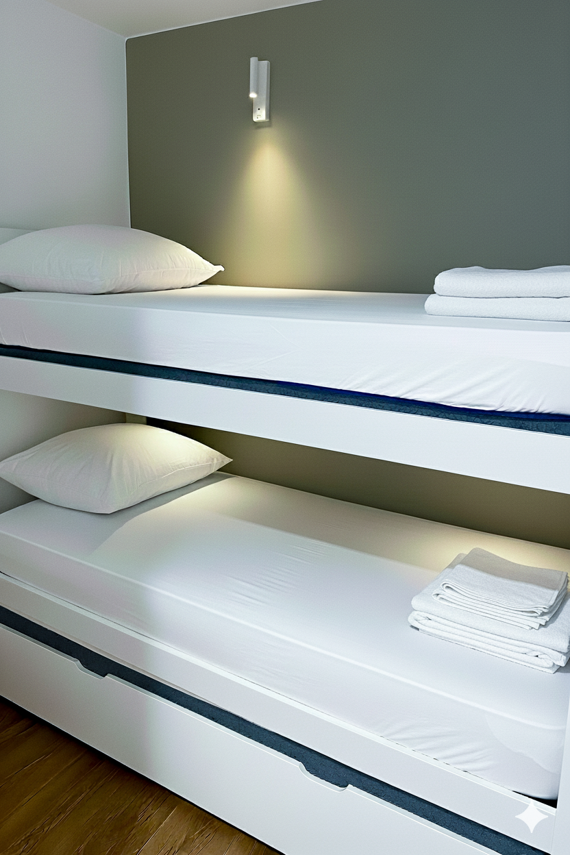The cabin room includes a glass partition overlooking the living area, allowing pleasant natural light to filter through while maintaining a calm and private atmosphere.