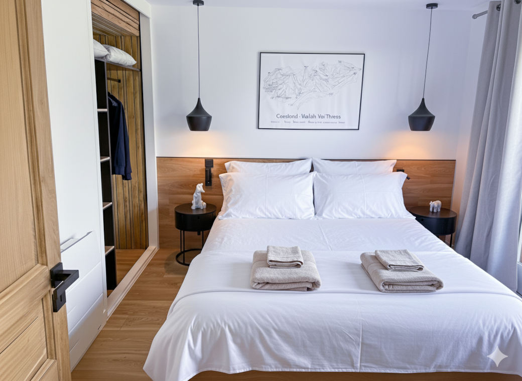 Furnished with a queen-size bed (160x200 cm) and high-quality bedding, this room ensures restful nights after your ski holidays in Méribel. The sleeping area is equipped with reading lights and USB/USB-C outlets, perfect for easily charging your electronic devices.