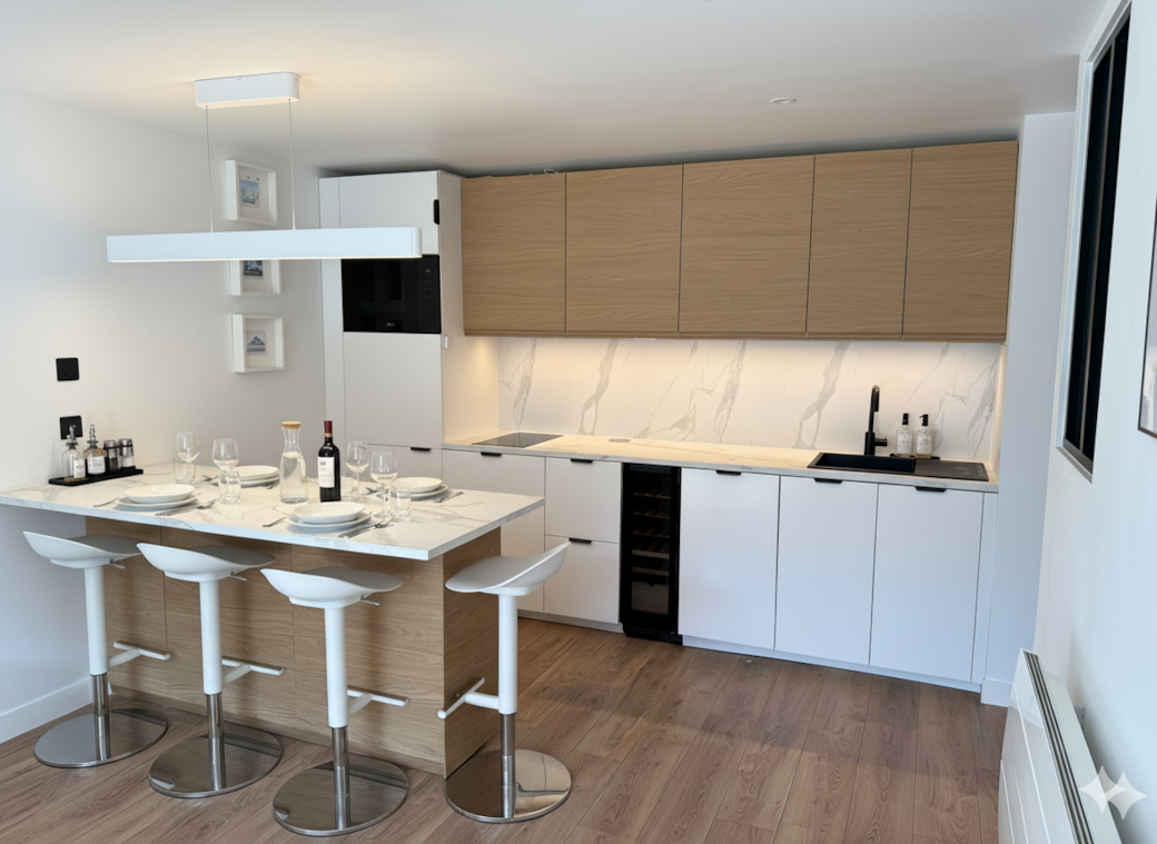 La cuisine moderne et entièrement équipée de notre appartement a été pensée pour allier praticité et convivialité. Vous y trouverez tout le nécessaire pour préparer vos repas comme à la maison, grâce à des équipements de qualité : lave-vaisselle, cave à vin, machine Nespresso, micro-ondes grill, bouilloire, grille-pain et une large gamme d’ustensiles de cuisine.